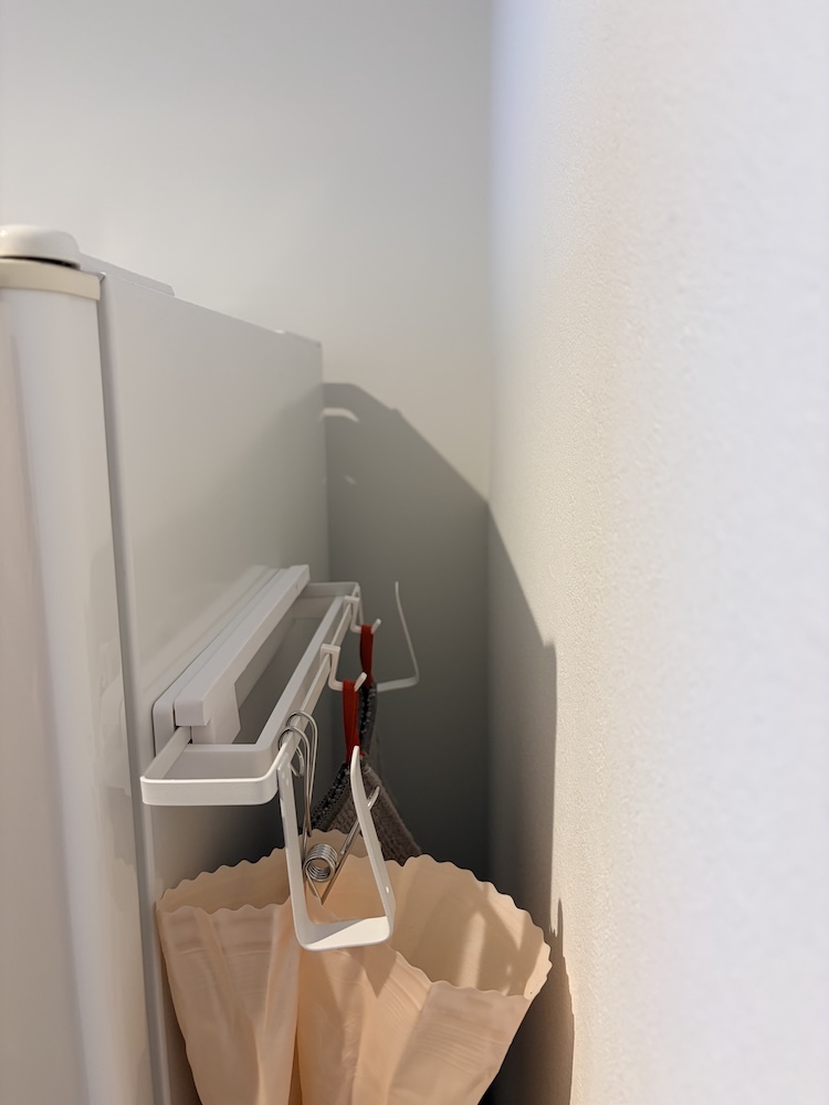 まず初めにプロトタイプとして制作したものはこれ(上記)です。壁に絵や額などを立てかけるためのスタンドを上下に配置しタオルバーを挟みスライドハンガーを作りましたよ。厚さの調整には裏面に厚紙を使い、ハンガーが抜けないようには2本のスクリューで、裏面には2cm強のネオジム磁石を配置して冷蔵庫にくっつくようにしました。〆て550円+α(ネジ、厚紙、テープ)。物を引っ掛けづらいのとちょっと不恰好?