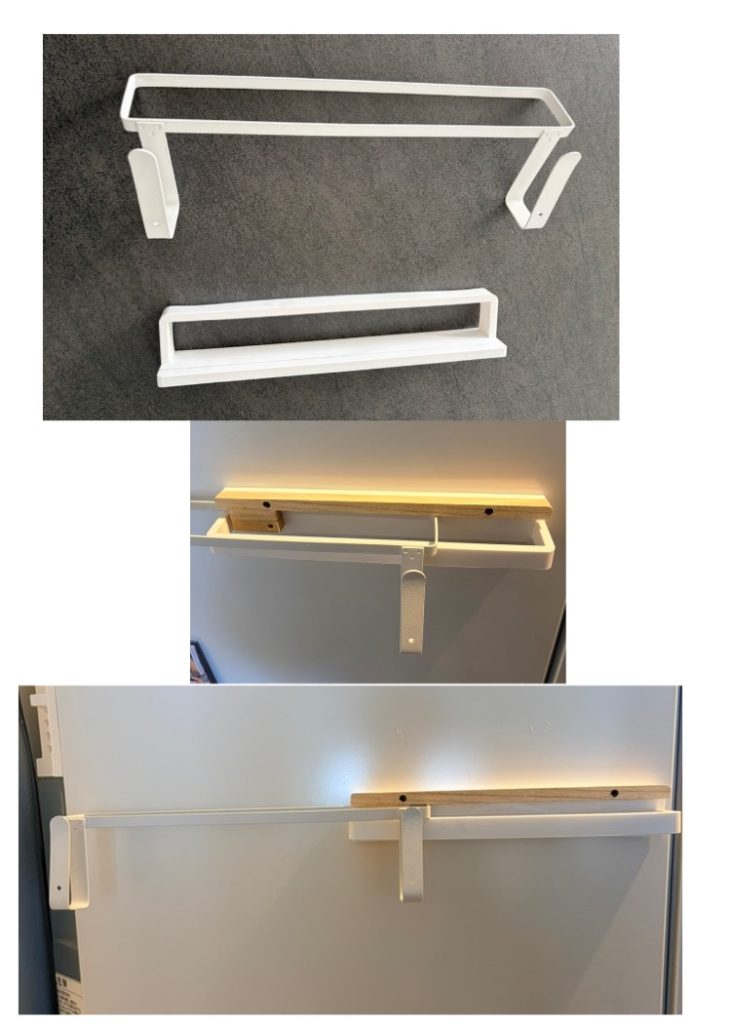 今100円ショップの商品の『じゃない使い方』なるものが流行っているそうです。ネットサーフィンにより常に便利グッズに対してアンテナを巡らせている妻は、タオルバーとスライドレールを組み合わせて作ったスライド式の収納ハンガーの動画を見つけてきました。冷蔵庫の側面スペースを利用してゴム手袋の置き場を作りたいとのことです。