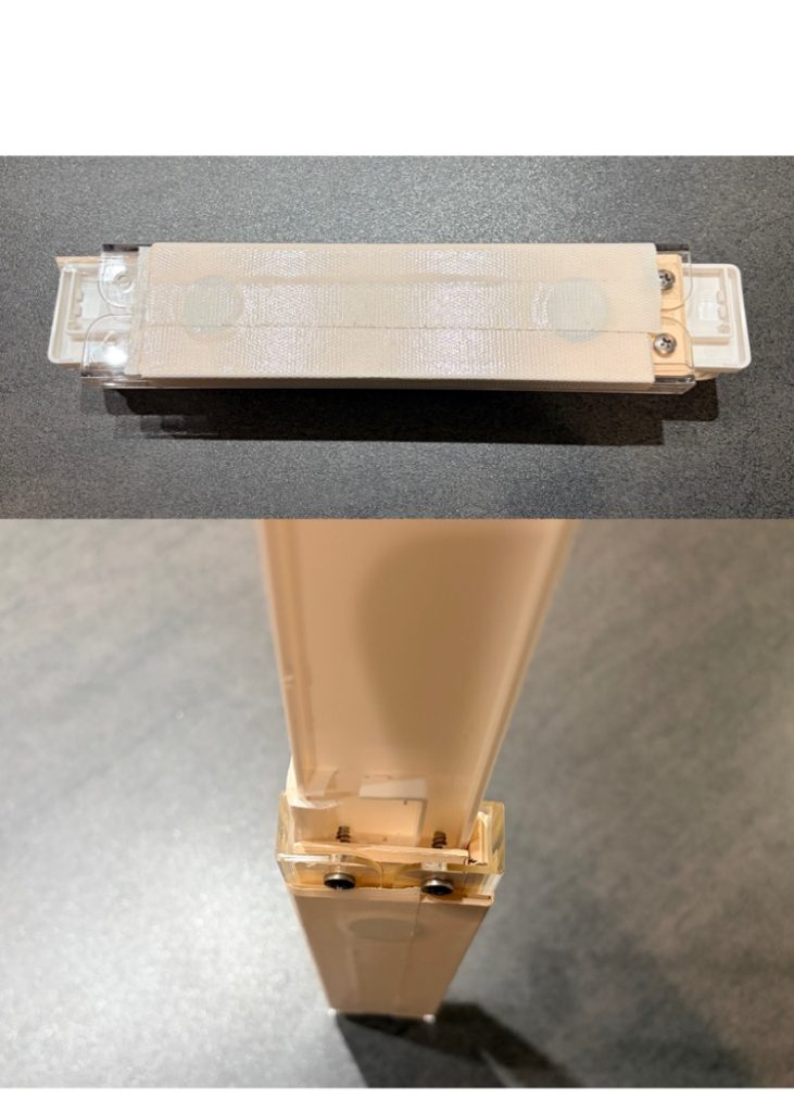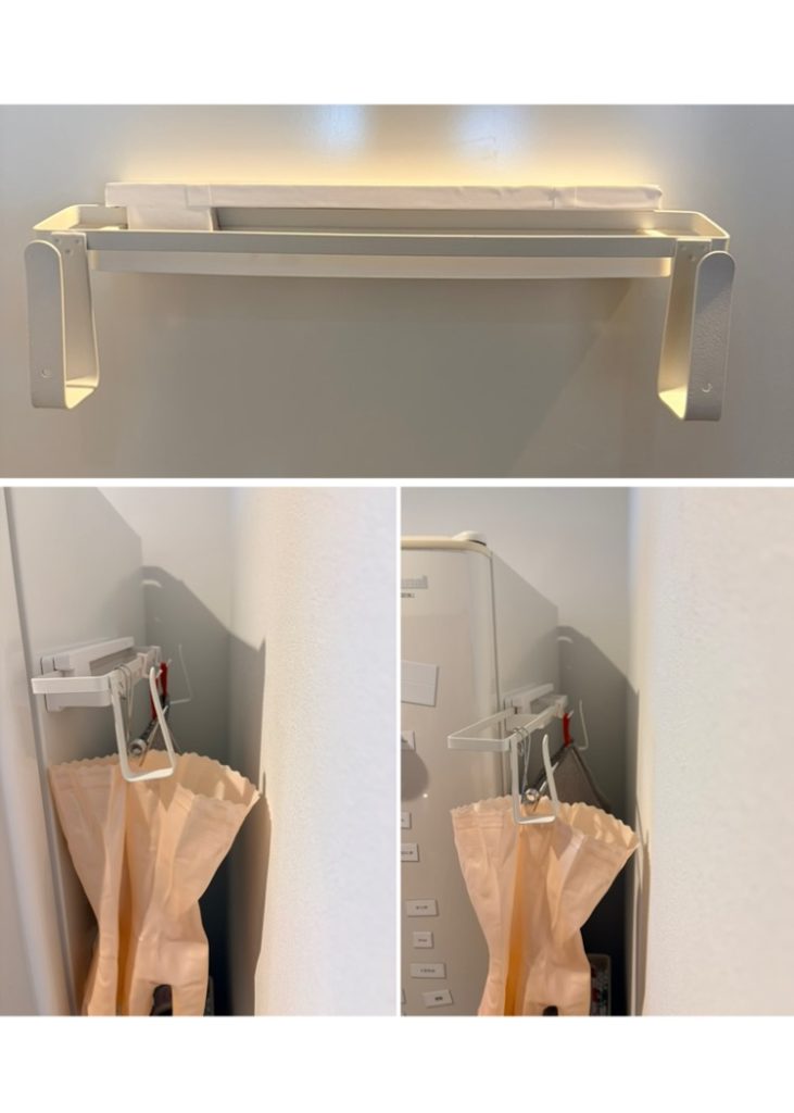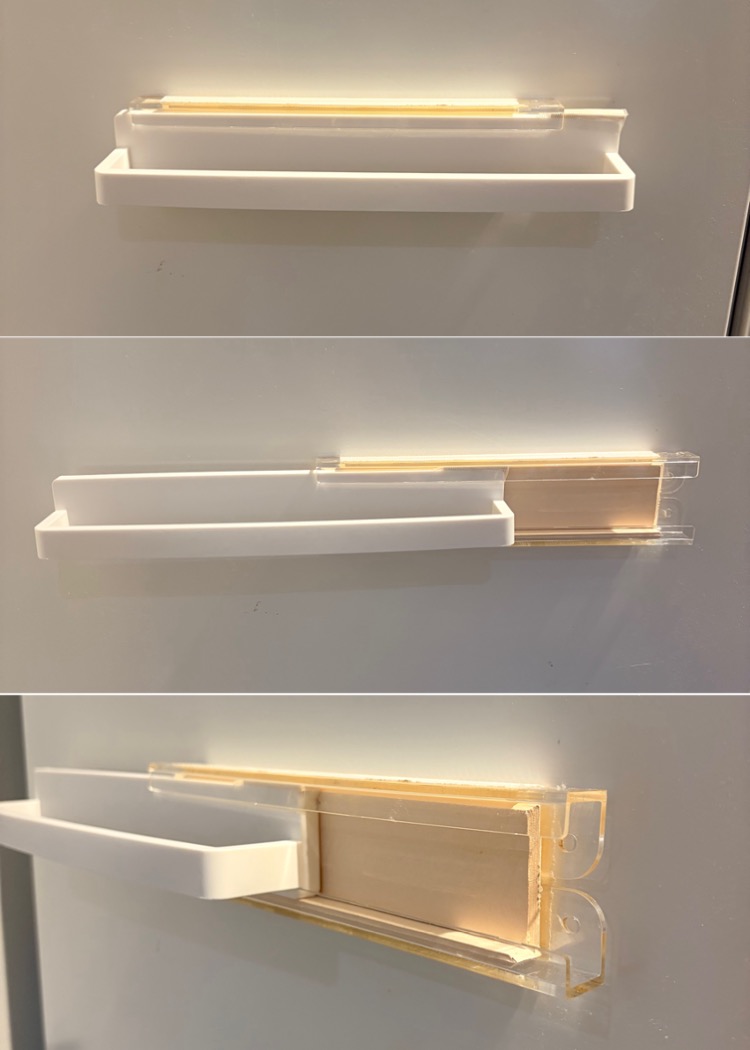 第二弾は種類の違うタオルバー2つを組み合わせて作成。一つはプラ製のマグネット式のタオルバー。第一弾ではこれをスライドさせましたが今度はこれをベースに、スライドさせるのはアイアンのタオル掛け。まずは9mm×9mmの角材をサイズに合わせてカット。組み合わせて3段で接着してます。真ん中部分の短い角材は2mm削って7mm×9mmになっています。この部分でアイアンのバーを挟む作戦です。プラ製バー裏面の磁石にかからないように3カ所でネジ固定。これでなんとか固定されてスライドできます。ともにループ状なので下面は常に前後の2点が接触しています。角材表面を余っていた白のダイノックスシートで包んで完成。現在はこれが稼働しています。〆て330円+α(ネジ、シート、接着剤)。
