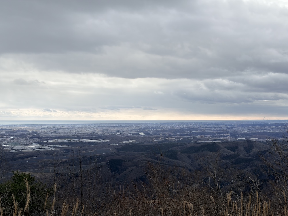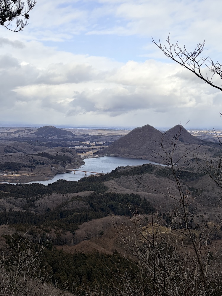 出発した時は薄日がさしていたものの登山口に着いた頃は太陽はなく曇りの天気。3台ほどの車が止まっていました。ちょうど下山してきた人もいて聞いてみると雪は全くないですよということ。登山開始にはかなり遅い11時ごろから登頂開始しました。遠目から見ると綺麗な三角形の山で、すなわち平坦のところがほとんどなく淡々と登り続けるといった山で、ひたすら登り続けるといった印象です。ただし登山道はよく整備されていて滑りにくいように、また階段上に形作られており、黙々と歩き続けました。熊出没のことは登山口までの車内などでは話題になっていましたが、用意した熊鈴も熊よけスプレーも忘れてきて無防備のまま行くことになってしまいました。歩き始めると冬の山で落葉後なので杉林を通り過ぎる時以外はこれといった葉っぱ、植物もなく脇目も触れず歩くしかないといった感じになってしまいました。途中、銚子の口展望台に立ち寄るとなんとも綺麗に眼下を見渡す事ができました。南川ダム(宮床ダム)で堰き止められてできた「あさひな湖」がくっきりと見えました。頂上付近の国見崎展望台からは太平洋が、仙台の街並みから石巻あたり?まで見る事ができました。
