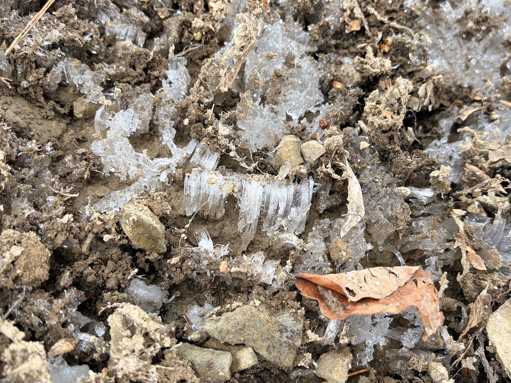 登山道にはどこにも雪はなく、寒さの表現は頂上付近に発見した霜柱程度かな。冬山といって警戒心MAXで望みましたが、無事に下山する事ができました。