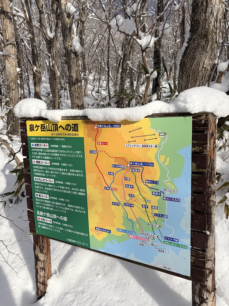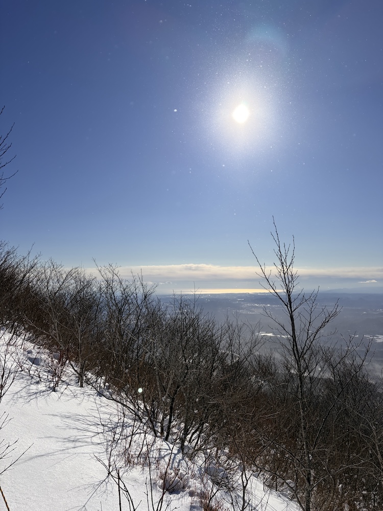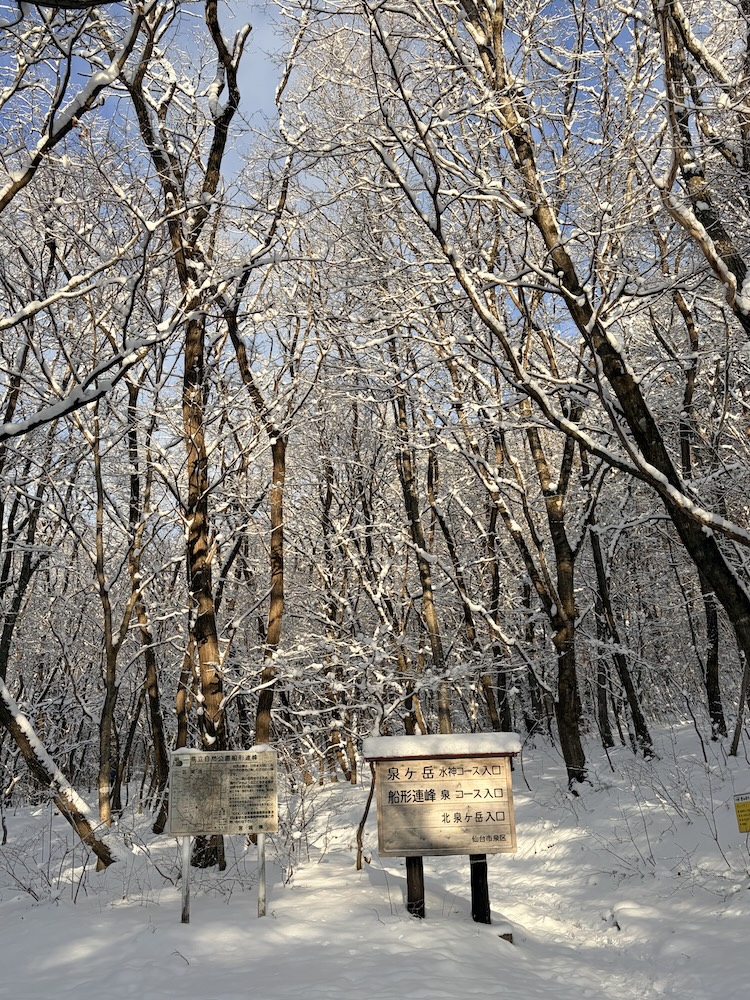 出発は予定より若干遅れてしまいましたが、8時ごろからスタートできました。昨晩雪が降ったようで辺りは一面の銀世界。駐車場は2-3cmの積雪。天気は晴れ、気温は-4℃。頂上は若干ガスがかかっていましたが、これから晴れてくる予想。防寒着を着込んできたのでちょっと肌寒い程度でスタートです。コースは水神コースで登って、滑降コースで下山してくる予定。まずは快調にスタートです。雪が積もっていると道の状態がわからないので歩きづらいです。最初は舗装道路なのかわかりませんでしたがフラットな道では蹴り足が若干滑るので力のロスが生じます。また水神コースの前半は多くがごろ岩の多い道で、雪のせいかそこが岩の上なのか岩の間なのかよくわからない。岩の上に乗ると滑るし、どこに足を伸ばすか迷います。晴れていても枝に積もった雪がパラパラと落ちてきます。途中からはアイゼンをつけてみようと靴にアイゼンをくくりつけて登り続けました。これまた初めての経験で歩きにくい。刃が痛むので岩の上を歩かぬようにと注意を受けながら。。。1時間近く歩いた後に後半戦。この頃になると服の中は汗ばんできており、中のダウンベストは脱ぐ羽目に、荷物が増えました。後半戦大岩の辺りからは傾斜が急になります。すでに大きく体力を削られています。雪も深くなってきてアイゼンが役立ってきました。足が右に左に振られ、少々膝を捻ってしまったようです。一人で登ってきた女性登山者にあっさりと抜かれペースがかなり落ちてきていますが、一歩一歩登っていきます。頂上の看板が見えてきました。頂上の少し手前が開けていて非常に景色が良いです。仙台の街から太平洋まで、目を映すと蔵王をはじめ山々が一望できました。最高😀の瞬間です。風の通り道なのか他より少し強めの風を感じます。スマホを岩の上に置いて写真を撮ろうと思いましたが断念しました。