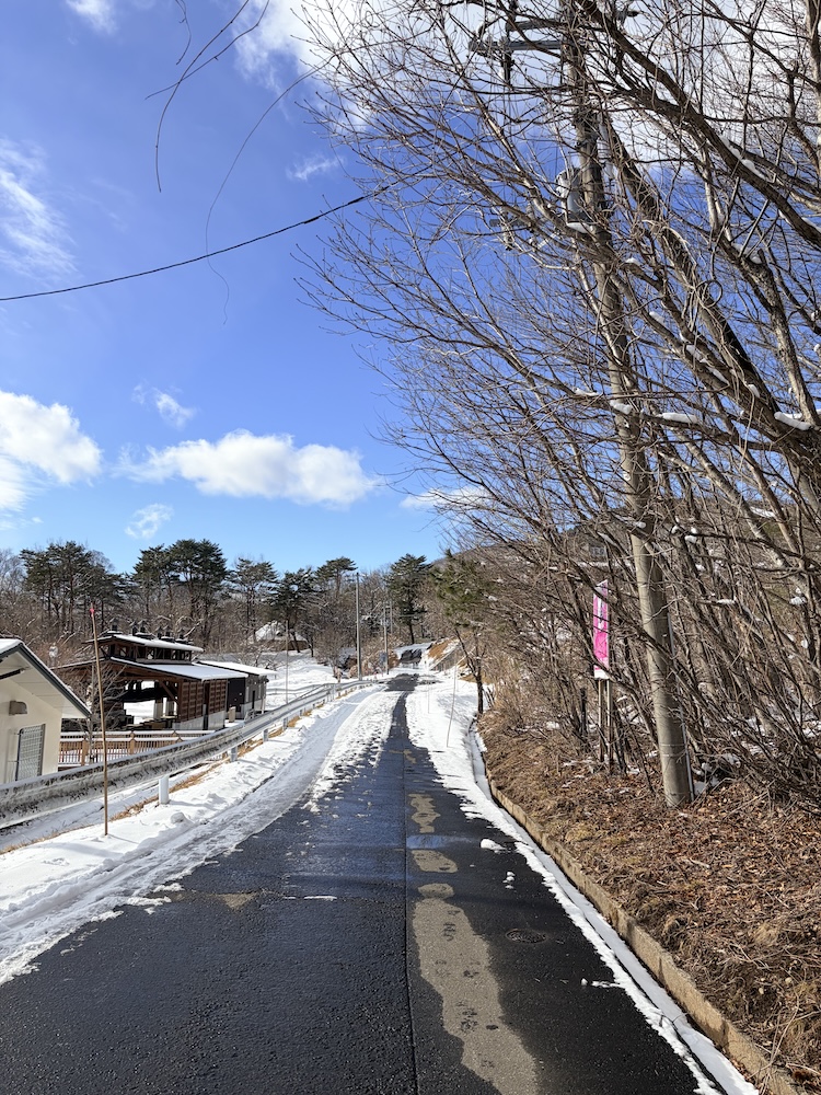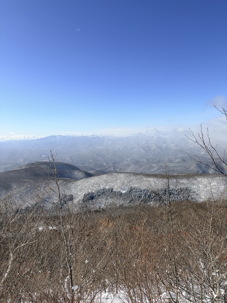 ここまで来れば、あとちょっと。ついに頂上です。頭上には雲一つなく、パウダースノーで最高でした。帰りは滑降コースから下山しました。このコースはかなり傾斜がきつい。事故を起こさないようにゆっくりおります。かなり降りてきたと思っていたのに未だ4分の1ぐらいそこは見返平でした。そこからは傾斜が少し緩くなりましたが、気温も上がってきたせいか緩んだ雪で滑る、滑る、滑る。ようやく下山しました。登山口から駐車場への道はかなり雪が溶けていました。